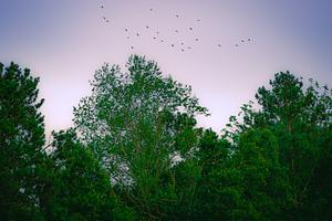 As dusk settles over the forest, a quiet symphony unfolds in the sky above. A flock of birds takes flight, silhouetted against the subtle gradient of twilight hues, ranging from the deepening blues of the evening sky to the soft lavender of the fading light. Below, the trees stand as silent witnesses to the day's end, their dense foliage forming a dark, intricate silhouette that whispers of the untold stories within the woods. This moment, captured in the stillness between day and night, reflects the daily ritual of the natural world, a delicate dance of life against the vast canvas of the sky.