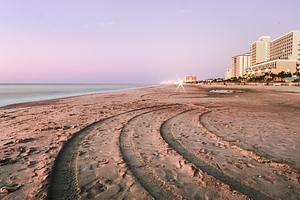As twilight descends upon the beach, the pastel hues of the sky cast a soft glow over the sandy expanse, creating a tranquil atmosphere. The tire tracks etched into the sand tell a story of the day's activities, now quiet as the bustle of beachgoers has faded. These meandering paths curve and weave, leading the eye towards the distant glow of the coastal city's lights, which twinkle like stars against the encroaching night. The smooth surface of the ocean reflects the last vestiges of daylight, while the high-rise hotels stand as silent sentinels over this serene seaside scene, marking the intersection where human habitation meets the natural beauty of the shore.