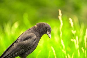 Amidst the verdant splendor of the Great Smoky Mountains, this striking image captures a solitary crow perched thoughtfully, its dark feathers a stark contrast against the vibrant green backdrop. The bird's intelligent gaze is turned slightly away, as if contemplating the lush, bountiful landscape it calls home. The soft focus on the grassy field highlights the delicate textures of nature, creating a serene atmosphere that encapsulates the untamed beauty of one of America's most beloved national parks.
