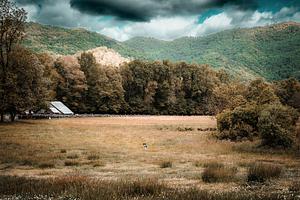 This photograph presents a tranquil scene set in a vast meadow at the foot of the rolling hills of the Great Smoky Mountains. A lone dog stands at the center, its figure small against the sprawling expanse of wild grasses that whisper in the breeze. The weathered barn to the side stands testament to the enduring presence of a simpler, rural life, blending seamlessly with the landscape. The forest's edge frames the meadow, with trees that have borne witness to countless sunrises and sunsets, their leaves a mosaic of green against the overcast sky. This is a snapshot of stillness and life, a serene moment where nature and its quiet companions share an unspoken bond.